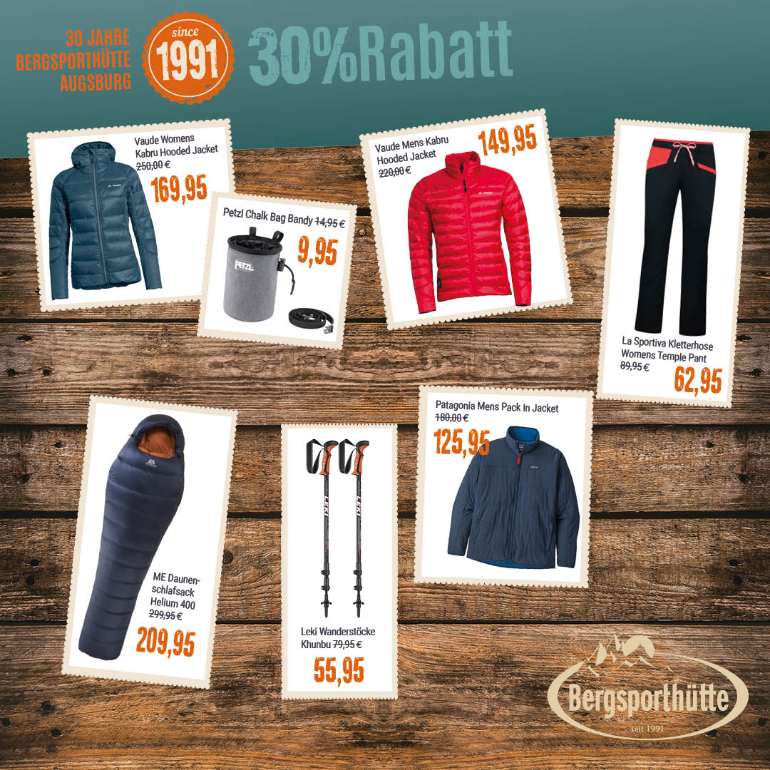 Natürlich gibt es zum Jubiläum auch tolle Angebote unserer Lieblingsmarken– zum Beispiel Daunenjacken von Vaude, Kletterhosen von La Sportiva oder Schlafsäcke von Mountain Equipment.